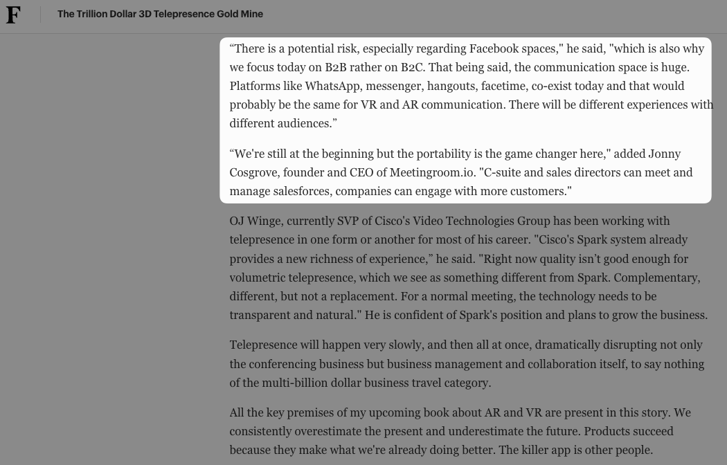 Telepresence will happen very slowly, and then all at once, dramatically disrupting not only the conferencing business but business management and collaboration itself. — Charlie Fink, Forbes